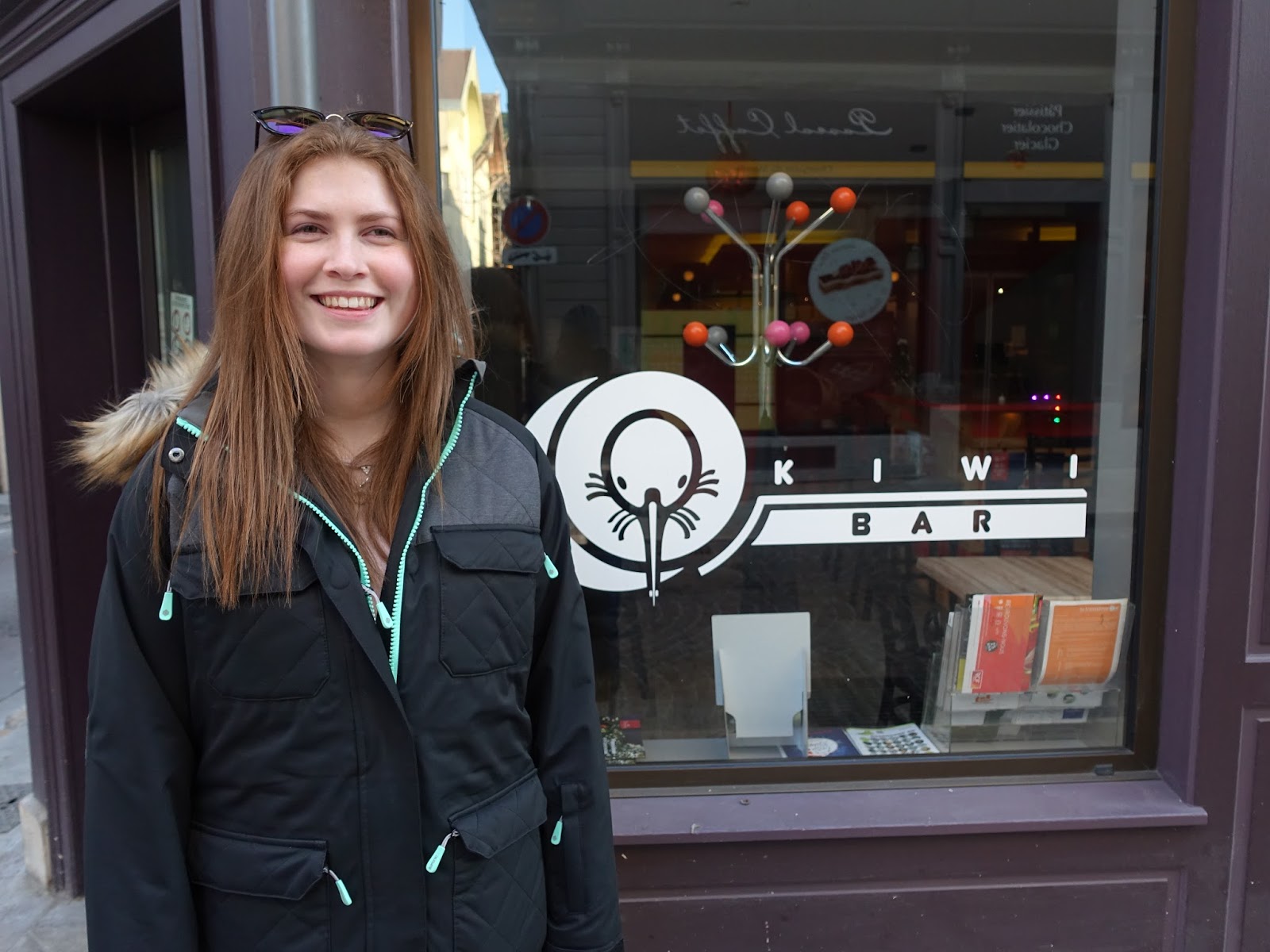 A Kiwi girl outside Kiwi bar in ... Troyes.